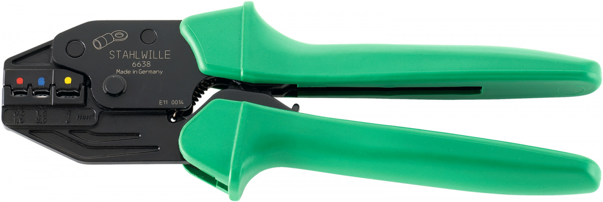 Dutinové kletě Na červené/modré/luté izolované koncovky kabelu, kolíkové koncovky kabelu, ploché zásuvky a pouzdra, okrouhlé konektory a pouzdra, nárazové a paralelní spojky odblokovatelné uzavření lehké ovládání odizolovací a řezné zařízení viz č. 6966 tvar lemování: [5