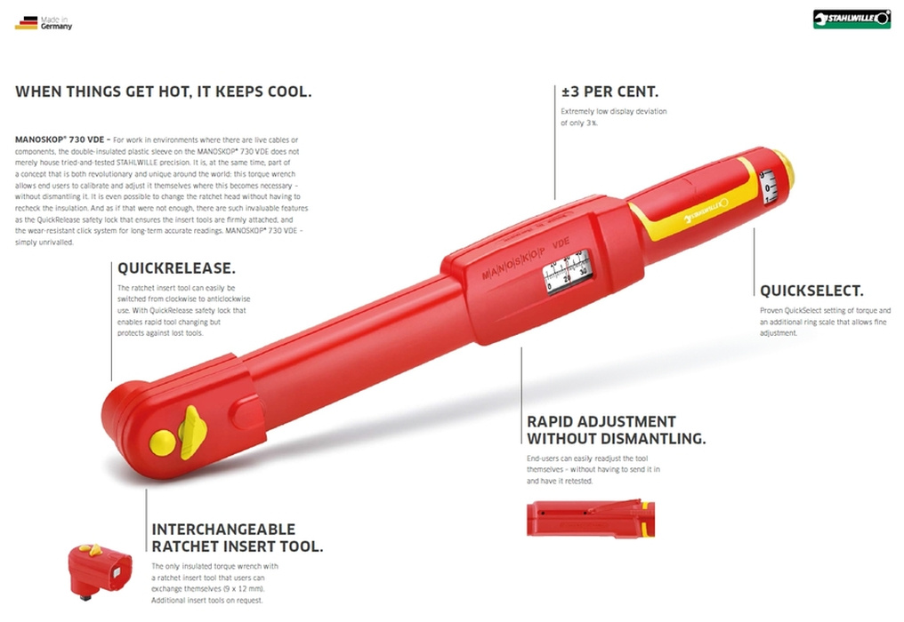 • Momentový klíč MANOSKOP 730 VDE je novinkou, která je určena pro práci v prostředí, kde jsou pod napětím elektrické kabely či jiné elektrické komponenty.