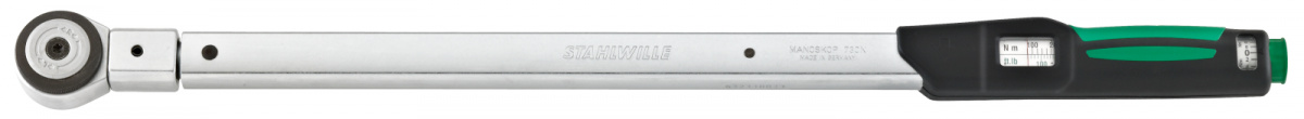 Momentový klíč MANOSKOP® Servis" s pevně zabudovanou ráčnou s jemným ozubením v pevném kufříku z umělé hmoty (Velikost 65 v ocelo-plechové skříňce). Garantovaný rozsah tolerance je ± 4 %.