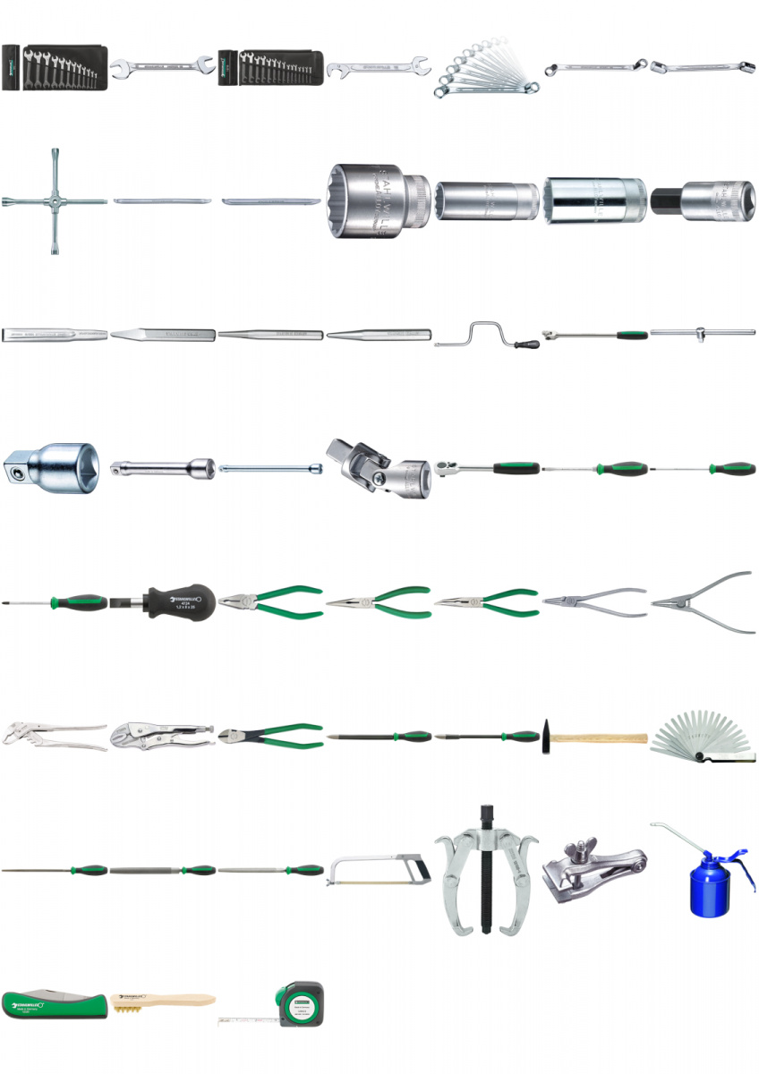 Velká dílenská souprava Obsahuje 127 kusů nářadí ------------------------------------------------------------------------------------------------------------------------------------------------------ Č. 10/12X rozměr klíče 6 x 7; 8 x 9; 10 x 11; 12 x 13; 14 x 15; 16 x 17; 18 x 19; 20 x 22; 21 x 23; 24 x 27; 25 x 28; 30 x 32 mm Č. 12/10 rozměr klíče 4; 4,5; 5; 5,5; 6; 7; 8; 9; 10; 11 mm Č. 20/12 rozměr klíče 6 x 7; 8 x 9; 10 x 11; 12 x 13; 14 x 15; 16 x 17; 18 x 19; 20 x 22; 21 x 23; 24 x 27; 25 x 28; 30 x 32 mm Č. 29 rozměr klíče 10 x 11; 12 x 13; 14 x 15; 16 x 18; 17 x 19; 21 x 23 mm Č. 35c Pkw rozměr klíče 17; 19; 22; 1/2" [D Č. 39 400 mm (2x) Č. 39/1 600 mm (2x) Č. 50 1/2" [a rozměr klíče10; 11; 12; 13; 14; 15; 16; 17; 18; 19; 20; 21; 22; 23; 24; 25; 26; 27; 28; 30; 32 mm Č. 51 1/2" [a rozměr klíče 13; 16 mm-5/8"; 17; 18; 19 mm; 20,8 mm-13/16"; 22; 24; 27; 30; 32 mm Č. 54 1/2" [a rozměr klíče 4; 5; 6; 8; 10; 12; 14 mm Č. 501 1/2" [D 433 mm Č. 504/15 1/2" [D 397 mm Č. 506 1/2" [D 300 mm Č. 509/2 1/2" [D [a 52 mm Č. 509/5 1/2" [D [a 130 mm Č. 509/10 1/2" [D [a 255 mm Č. 510 1/2" [D [a 71 mm Č. 512 1/2" [D Č. 100/8 200 mm Č. 103 150 mm Č. 104 120 x 4 mm Č. 105 100 x 10 mm Č. 4622 velikost 2 (1,2 x 6,5 x 125 mm)velikost 3 (1,2 x 8,0 x 150 mm)velikost 5 (2,0 x 12,0 x 200 mm) Č. 4628 velikost 2 (0,6 x 3,5 x 75 mm)velikost 4 (0,8 x 4,0 x 125 mm) Č. 4630 velikost 1; 2; 3 Č. 4724 velikost 2 (1,0 x 5,5 x 25 mm) Č. 65 01 6 180 Č. 65 29 6 200 Č. 65 30 6 200 Č. 65 43 4 002 Č. 65 45 4 002 Č. 65 54 4 250 Č. 65 64 2 250 Č. 66 02 6 160 Č. 10670 310 mm Č. 10676 85 x 12 x 315 mm Č. 10960 500 g Č. 11095/13 0,05-1 mm Č. 12025 210 mm Č. 12030 260 mm Č. 12035 210 mm Č. 12050 300 mm Č. 12150 200 mm Č. 12200 145 mm Č. 12250 Č. 12320 Č. 12375 Č. 12935/3 3 m ------------------------------------------------------------------------------------------------------------------------------------------------------