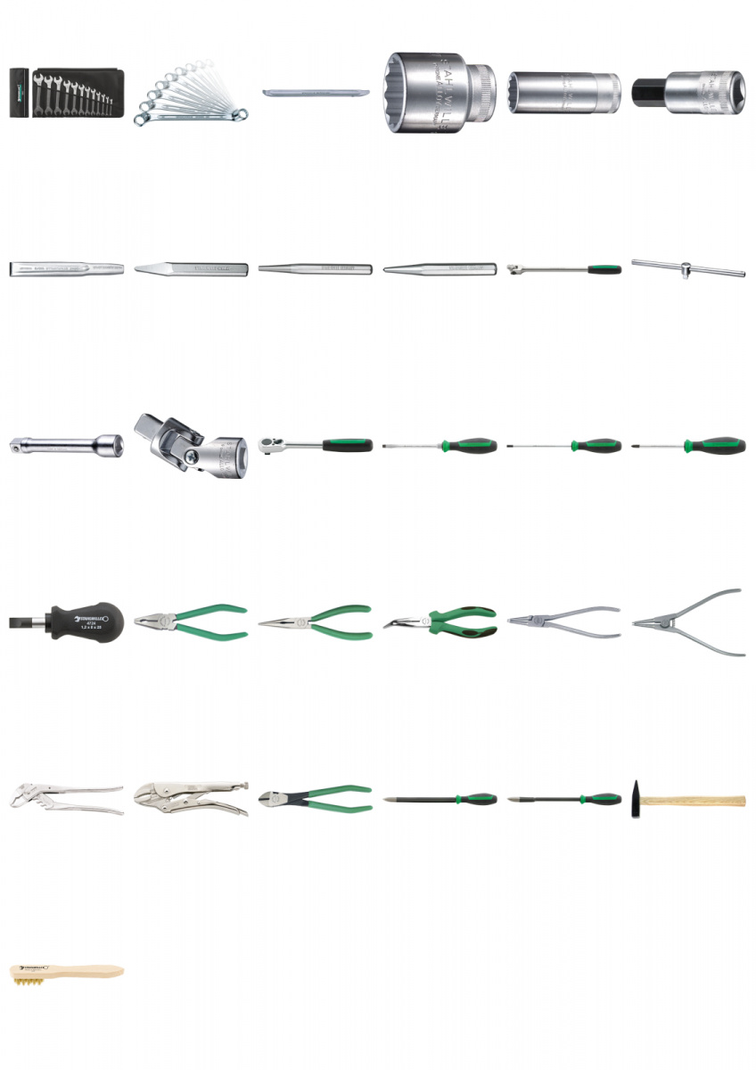 souprava nářadí pro montání dílny dopravních prostředků (Kfz) Obsahuje 84 kusů nářadí ----------------------------------------------------------------------------------------------------------------------------------------------------- Č. 10/12 rozměr klíče 6 x 7; 8 x 9; 10 x 11; 12 x 13; 14 x 15; 16 x 17; 18 x 19; 20 x 22; 21 x 23; 24 x 27; 25 x 28; 30 x 32 mm Č. 20/12 rozměr klíče 6 x 7; 8 x 9; 10 x 11; 12 x 13; 14 x 15; 16 x 17; 18 x 19; 20 x 22; 21 x 23; 24 x 27; 25 x 28; 30 x 32 mm Č. 39 400 mm (2x) Č. 50 1/2" [a rozměr klíče 10; 11; 12; 13; 14; 15; 16; 17; 19; 21; 22; 23; 24; 26; 27; 30; 32 mm Č. 51 1/2" [a rozměr klíče 16 mm-5/8"; 20,8 mm-13/16" Č. 54 1/2" [a rozměr klíče 4; 5; 6; 8; 10; 12; 14 mm Č. 504/15 1/2" [D 397 mm Č. 506 1/2" [D 300 mm Č. 509/2 1/2" [D [a 52 mm Č. 509/5 1/2" [D [a 130 mm Č. 509/10 1/2" [D [a 255 mm Č. 510 1/2" [D [a 71 mm Č. 512 1/2" [D Č. 100/8 200 mm Č. 103 150 mm Č. 104 120 x 4 mm Č. 105 100 x 10 mm Č. 4622 velikost 2 (1,2 x 6,5 x 125 mm)velikost 3 (1,2 x 8,0 x 150 mm)velikost 5 (2,0 x 12,0 x 200 mm) Č. 4628 velikost 2 (0,6 x 3,5 x 75 mm)velikost 4 (0,8 x 4,0 x 125 mm) Č. 4630 velikost 1; 2; 3 Č. 4724 velikost 2 (1,0 x 5,5 x 25 mm) Č. 65 01 6 180 Č. 65 29 6 200 Č. 65 30 6 200 Č. 65 43 4 002 Č. 65 45 4 002 Č. 65 54 4 250 Č. 65 64 2 250 Č. 66 02 6 160 Č. 10670 310 mm Č. 10676 85 x 12 x 315 mm Č. 10960 500 g Č. 12375 -----------------------------------------------------------------------------------------------------------------------------------------------------