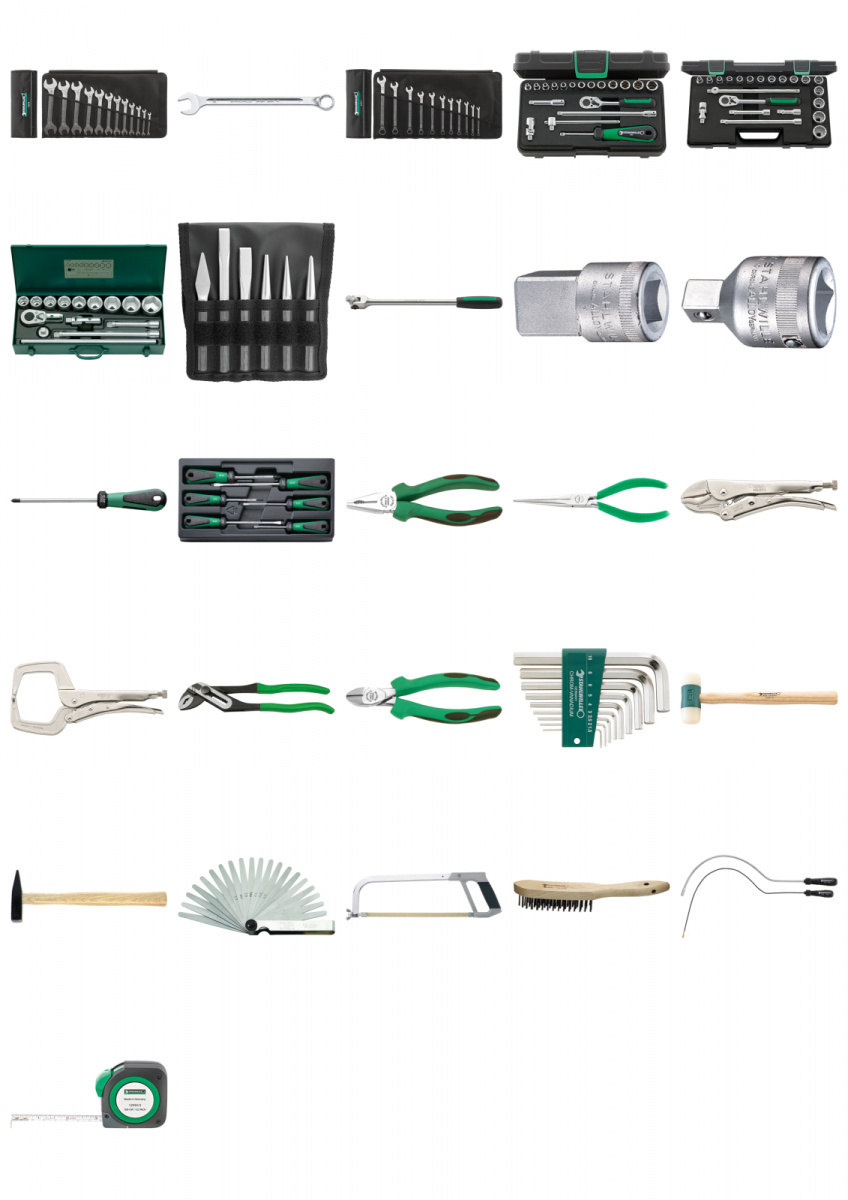 Sada nářadí 129 kusů nářadí ---------------------------------------------------------------------------------------------------------------------------------------------------------------------------------------------------- Č. 10/9 rozměr klíče 6 x 7; 8 x 9; 10 x 11; 12 x 13; 14 x 15; 16 x 17; 18 x 19; 20 x 22; 21 x 24 mm Č. 14 rozměr klíče 6; 7; 8; 9; 10; 11; 12; 13; 14; 15; 16; 17; 18; 19; 20; 21; 22; 24; 27; 30; 32; 34; 36 mm Č. 40/13/6 1/4" [a Č. 40 rozměr klíče 3,5; 4; 4,5; 5; 5,5; 6; 7; 8; 9; 10; 11; 12; 13 mm; Č. 400; 404; 405/2; 405/6; 407; 415 Č. 50/16/6 1/2" [a Č. 50: rozměr klíče 10; 11; 12; 13; 14; 15; 16; 17; 18; 19; 21; 22; 24; 27; 30; 32 mmrozměr klíče 506; 509/5; 509/10; 506; 510; 512 Č. 504/15 1/2" [D 397 mm Č. 514 3/4" [D 1/2" [a Č. 55/9/6N 3/4" [a Č. 55: rozměr klíče 32; 34; 36; 38; 41; 46; 50; 55; 60 mmČ. 552; 554; 556; 558; 559/8; 559/16 Č. 568 1/2" [D 3/4" [a Č. 102-5/6T Č. 104/120 x 2; 120 x 4 mmČ. 105/120 x 10 mmČ. 106/125 mm; 150 mmČ. 107/125 mm Č. 4840 velikost 1; 2 Č. 4891 [r 4820: 0,6 x 3,5 x 75 mm0,8 x 4,0 x 100 mm1,0 x 5,5 x 125 mm1,2 x 6,5 x 150 mm[k 4830: Gr. 1; 2 Č. 10760CV/9 rozměr klíče 1,5; 2; 2,5; 3; 4; 5; 6; 8; 10 mm Č. 65 01 5 180 Č. 65 31 5 170 Č. 65 63 2 250 Č. 65 67 2 280 Č. 65 72 6 240 Č. 66 00 5 160 Č. 10956 [O 35 mm Č. 10960 300; 500 g Č. 11095/20 20 plátků 0,05-1 mm Č. 12050 300 mm Č. 12050R 10 plátků Č. 12374 Č. 12600 1800 g Č. 12931 3 m ----------------------------------------------------------------------------------------------------------------------------------------------------------------------------------------------------