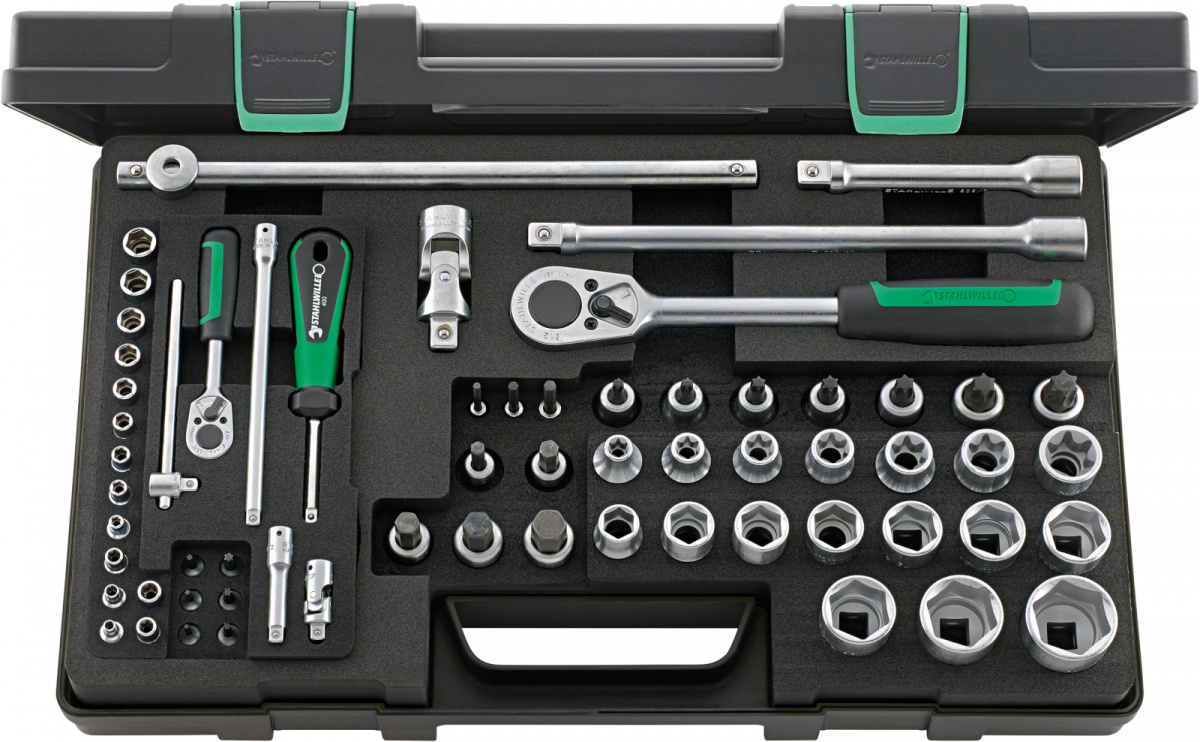 Sada nástrčných klíčů 1/4, 1/2" [u v robustní, stohovatelném boxu z plastu ABS, 63-dílná Obsah: 9 ks nástrčná hlavice se estihranem č. 40: 4; 5; 5,5; 6; 7; 8; 9; 10; 11 mm 10 ks nástrčná hlavice se estihranem č. 52: rozměr klíče 13; 16; 17; 18; 19; 21; 22; 24; 27; 30 mm 5 ks nástrčná hlavice pro roubky s vnějím TORX® č. 40TX: velikost E4; E5; E6; E7; E8 7 ks nástrčná hlavice pro roubky s vnějím TORX® č. 50TX: velikost E10; E12; E14; E16; E18; E20; E24 3 ks INHEX-hlavice č. 44: rozměr klíče 3; 4; 5 mm 5 ks INHEX hlavice č. 54: rozměr klíče 6; 8; 10; 12; 14 mm 6 ks roubovací hlavice pro roubky s vnitřním TORX® č. 44KTX: velikost T8; T9; T10; T15; T20; T25 7 ks roubovací halvice pro roubky s vnitřním TORX® č. 54TX: velikost T27; T30; T40; T45; T50; T55; T60 2 ks ráčňa č. 415, č. 512 4 ks prodluovací díl č. 405/2 (54 mm), č. 509/5 (130 mm), č. 405/6 (150 mm), č. 509/10 (255 mm) 2 ks kardanový kloub č. 407; č. 410 1 ks nástrčná rukoje č. 400 2 ks křiná rukoje č. 404, č. 506