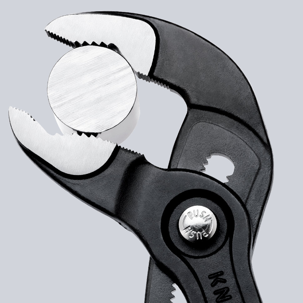 Nastavení stisknutím tlačítka přímo na obrobku. Jemné nastavení pro optimální přizpůsobení různým velikostem obrobků a ergonomickou polohu rukojetí. Samosvorné na trubkách a maticích: žádné sklouzávání na sevřené součásti, práce šetřící síly a vynaložení menší síly. Plochy čelistí se speciálně kalenými zuby, tvrdost zubů asi 61 HRC: trvale spolehlivé uchopení díky vysoké odolnosti proti opotřebení. Posuvný průchozí čep kloubu: vysoká stabilita díky dvojitému vedení. Spolehlivé zaskočení čepu kloubu: žádné neúmyslné přenastavení. Kryt chrání prsty před skřípnutím. Kleště se závěsným okem pro upevnění pojistného lanka.