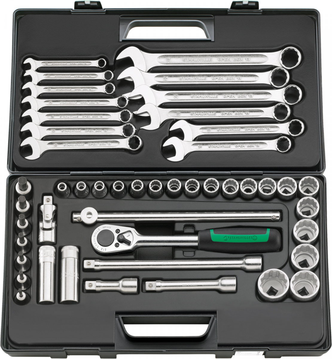Sada nástrčných klíčů 1/2" [u v pevné oceloplechové skříňce, 47-dílná Obsah: 19 ks nástrčná hlavice s dvojitým estihranem č. 50: rozměr klíče 8; 9; 10; 11; 12; 13; 14; 15; 16; 17; 18; 19; 21; 22; 24; 27; 30; 32; 34 mm 2 ks nástrčná prodlouená hlavice s gumovou vlokou č. 51: rozměr klíče 16 mm-5/8"; 20,8 mm-13/16" 13 ks očkový-vidlicový klíč č. 13: rozměr klíče 10; 11; 12; 13; 14; 15; 16; 17; 18; 19; 21; 22; 24 mm 1 ks ráčna č. 512 3 ks prodluovací díl č. 509/3 (75mm), č. 509/5 (130 mm), č. 509/10 (255 mm) 1 ks kříová rukoje č. 506 1 ks kardanový kloub č. 510
