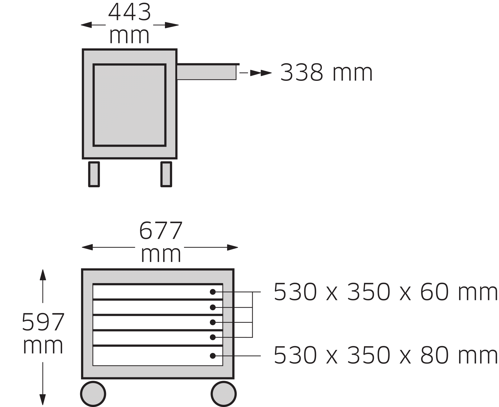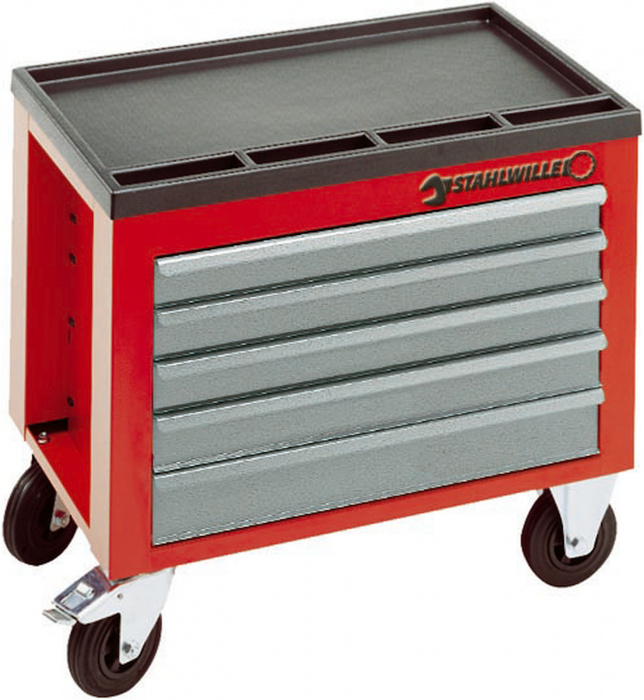 Dílenský vozík ROLLBOX se zásuvkami (uplíky) Se 4 kusy koleček o půměru 125 mm, ze kterých jsou 2 otočné válečky, jedno s fixační brzdou. Vybavený 5-ti kusy zásuvek (uplíků) stříbrné barvy (rozměry: 4 kusy výka 60 mm a 1 kus výka 80 mm). Zásuvky jsou ve vysunuté poloze fixovatelné a vyjímatelné. Na horní části vozíku jsou přihrádky z oleji vzdorné a skydrolu vzdorné umělé hmnoty, na ukáládání drobných součástek. Na bok vozíku je moné dodatečně namontovat drák č. SDH 921 na spreje (prosíme objednávat samostatně).