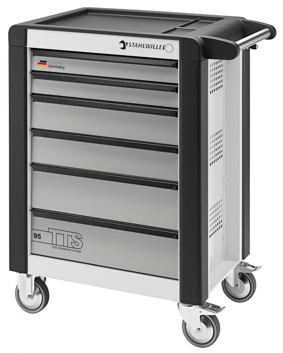 Dílenský vozík TTS 6 snadno vyjímatelných zásuvek s plnovýsuvem a pojezdem vybaveným loisky s kuličkovými průvodnicemi třístupňový bezpečnostní koncept:- centrální uzamykání pomocí bočního zámku s válcovou vlokou a odklápěcího klíčku- Samouzamykací zámky zamezí neúmyslnému otevření za jízdy- ochrana proti převrení - nelze současně vytáhnout více zásuvek najednou madlo z ulechtilé oceli se zesílením v místě připojení na korpus ochranné nárazníky s tlumením nárazu po celém obvodu vysoce odolná plastová odkládací deska z ABS, odolná vůči olejům a skydrolu, s přihrádkami pro malé díly kolečka o průměru 125 mm, odolná vůči olejům a kyselinám, s ochranou proti vláknům za účelem ochrany loisek před nečistotami a vlákny, se dvěma zajiovacími brzdami drák papírových rolí 5 standardních barev, dvoubarevné zásuvky (stříbrné s černým madlem) oboustranná deska s otvory pro háky č. 8031-8041, např. pro větí nástroje lze vybavit standardními i TCS vlokami firmy STAHLWILLE