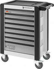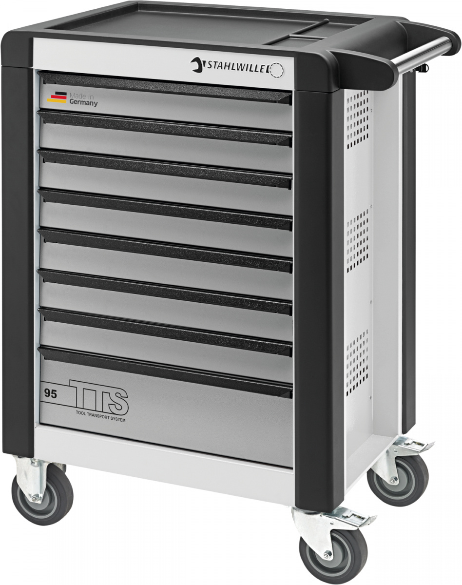 Dílenský vozík TTS 8 snadno vyjímatelných zásuvek s plnovýsuvem a pojezdem vybaveným loisky s kuličkovými průvodnicemi třístupňový bezpečnostní koncept:- centrální uzamykání pomocí bočního zámku s válcovou vlokou a odklápěcího klíčku- Samouzamykací zámky zamezí neúmyslnému otevření za jízdy- ochrana proti převrení - nelze současně vytáhnout více zásuvek najednou madlo z ulechtilé oceli se zesílením v místě připojení na korpus ochranné nárazníky s tlumením nárazu po celém obvodu vysoce odolná plastová odkládací deska z ABS, odolná vůči olejům a skydrolu, s přihrádkami pro malé díly kolečka o průměru 125 mm, odolná vůči olejům a kyselinám, s ochranou proti vláknům za účelem ochrany loisek před nečistotami a vlákny, se dvěma zajiovacími brzdami drák papírových rolí 5 standardních barev, dvoubarevné zásuvky (stříbrné s černým madlem) oboustranná deska s otvory pro háky č. 8031-8041, např. pro větí nástroje lze vybavit standardními i TCS vlokami firmy STAHLWILLE