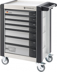 Dílenský vozík TTS 7 snadno vyjímatelných zásuvek s plnovýsuvem a pojezdem vybaveným loisky s kuličkovými průvodnicemi třístupňový bezpečnostní koncept:- centrální uzamykání pomocí bočního zámku s válcovou vlokou a odklápěcího klíčku- Samouzamykací zámky zamezí neúmyslnému otevření za jízdy- ochrana proti převrení - nelze současně vytáhnout více zásuvek najednou zásuvky lze označovat několika nálepkami na kadé zásuvce (arch s nálepkami je součástí dodávky) madlo z ulechtilé oceli se zesílením v místě připojení na korpus ochranné nárazníky s tlumením nárazu po celém obvodu odolná pracovní a odkládací plocha, s ochranou proti pokrábání, jako i nerezový ukončovací panel s kosočtvercovým reliéfem kolečka o průměru 125 mm, odolná vůči olejům a kyselinám, s ochranou proti vláknům za účelem ochrany loisek před nečistotami a vlákny, se dvěma zajiovacími brzdami drák papírových rolí 5 standardních barev, dvoubarevné zásuvky (stříbrné s černým madlem) oboustranná deska s otvory pro háky č. 8031-8041, např. pro větí nástroje kze vybavit standardními i TCS vlokami firmy STAHLWILLE