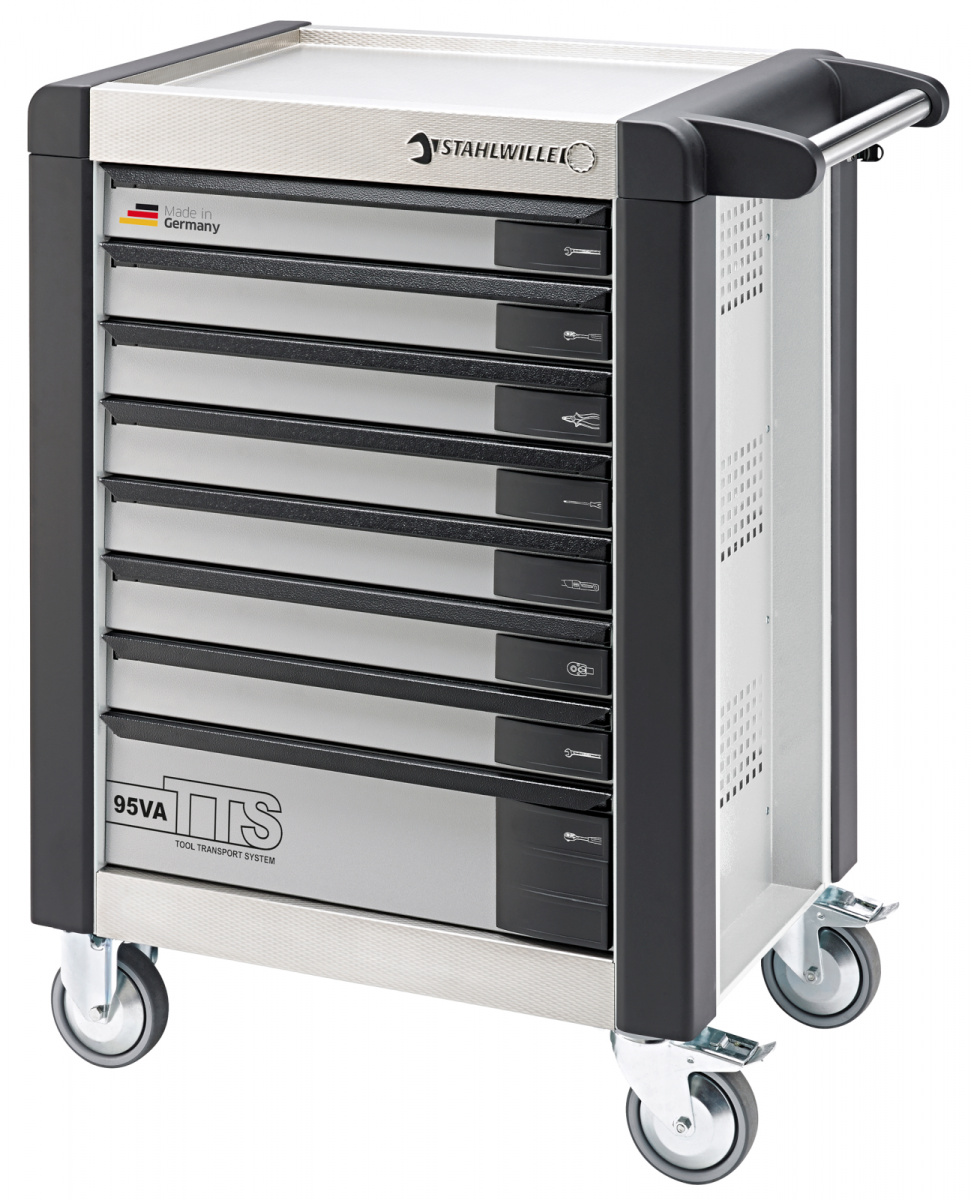 Dílenský vozík TTS 8 snadno vyjímatelných zásuvek s plnovýsuvem a pojezdem vybaveným loisky s kuličkovými průvodnicemi třístupňový bezpečnostní koncept:- centrální uzamykání pomocí bočního zámku s válcovou vlokou a odklápěcího klíčku- Samouzamykací zámky zamezí neúmyslnému otevření za jízdy- ochrana proti převrení - nelze současně vytáhnout více zásuvek najednou zásuvky lze označovat několika nálepkami na kadé zásuvce (arch s nálepkami je součástí dodávky) madlo z ulechtilé oceli se zesílením v místě připojení na korpus ochranné nárazníky s tlumením nárazu po celém obvodu odolná pracovní a odkládací plocha, s ochranou proti pokrábání, jako i nerezový ukončovací panel s kosočtvercovým reliéfem kolečka o průměru 125 mm, odolná vůči olejům a kyselinám, s ochranou proti vláknům za účelem ochrany loisek před nečistotami a vlákny, se dvěma zajiovacími brzdami drák papírových rolí 5 standardních barev, dvoubarevné zásuvky (stříbrné s černým madlem) oboustranná deska s otvory pro háky č. 8031-8041, např. pro větí nástroje kze vybavit standardními i TCS vlokami firmy STAHLWILLE