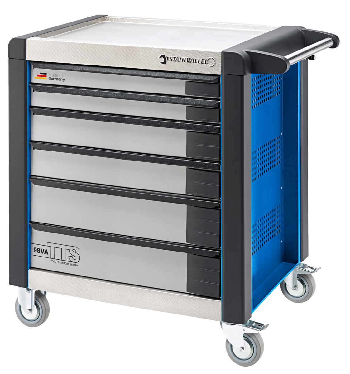Dílenský vozík TTS 100% zvětený objem zásuvek oproti verzi 90, 95 a 95VA. 6 snadno vyjímatelných zásuvek s plnovýsuvem a pojezdem vybaveným loisky s kuličkovými průvodnicemi třístupňový bezpečnostní koncept:- centrální uzamykání pomocí bočního zámku s válcovou vlokou a odklápěcího klíčku- Samouzamykací zámky zamezí neúmyslnému otevření za jízdy- ochrana proti převrení - nelze současně vytáhnout více zásuvek najednou zásuvky lze označovat několika nálepkami na kadé zásuvce (arch s nálepkami je součástí dodávky) madlo z ulechtilé oceli se zesílením v místě připojení na korpus ochranné nárazníky s tlumením nárazu po celém obvodu odolná pracovní a odkládací plocha, s ochranou proti pokrábání, jako i nerezový ukončovací panel s kosočtvercovým reliéfem kolečka s kuličkovými loisky a snadným chodem o průměru 125 mm, odolná vůči olejům a kyselinám, s ochranou proti vláknům za účelem ochrany loisek před nečistotami a vlákny, se dvěma zajiovacími brzdami drák papírových rolí 5 standardních barev, dvoubarevné zásuvky (stříbrné s černým madlem) oboustranná deska s otvory pro háky č. 8031-8041, např. pro větí nástroje kze vybavit standardními i TCS vlokami firmy STAHLWILLE