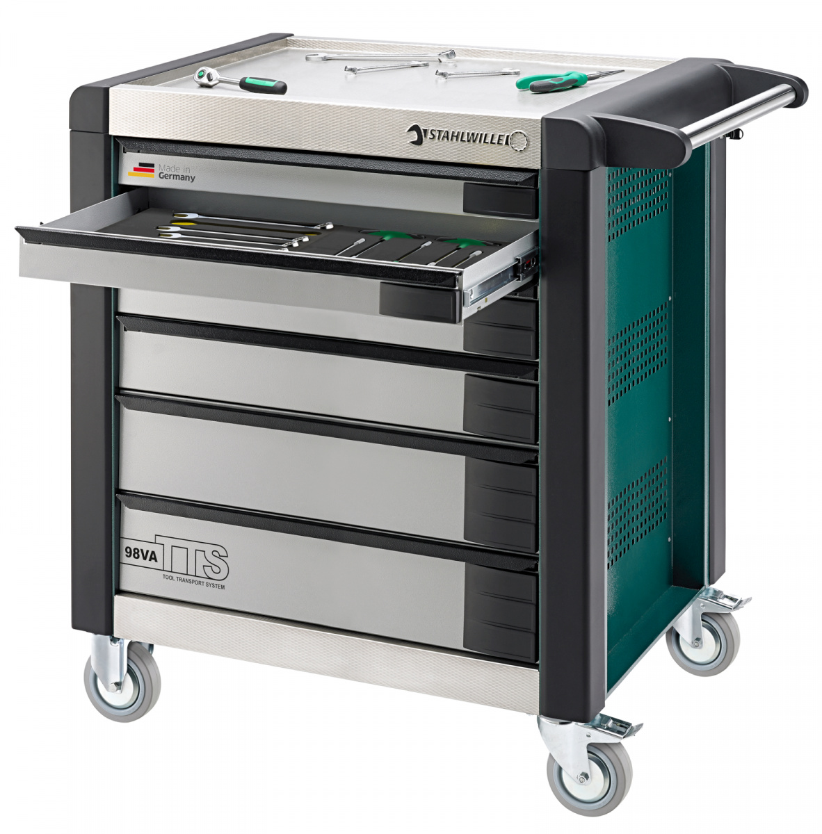 Dílenský vozík TTS 100% zvětený objem zásuvek oproti verzi 90, 95 a 95VA. 6 snadno vyjímatelných zásuvek s plnovýsuvem a pojezdem vybaveným loisky s kuličkovými průvodnicemi třístupňový bezpečnostní koncept:- centrální uzamykání pomocí bočního zámku s válcovou vlokou a odklápěcího klíčku- Samouzamykací zámky zamezí neúmyslnému otevření za jízdy- ochrana proti převrení - nelze současně vytáhnout více zásuvek najednou zásuvky lze označovat několika nálepkami na kadé zásuvce (arch s nálepkami je součástí dodávky) madlo z ulechtilé oceli se zesílením v místě připojení na korpus ochranné nárazníky s tlumením nárazu po celém obvodu odolná pracovní a odkládací plocha, s ochranou proti pokrábání, jako i nerezový ukončovací panel s kosočtvercovým reliéfem kolečka s kuličkovými loisky a snadným chodem o průměru 125 mm, odolná vůči olejům a kyselinám, s ochranou proti vláknům za účelem ochrany loisek před nečistotami a vlákny, se dvěma zajiovacími brzdami drák papírových rolí 5 standardních barev, dvoubarevné zásuvky (stříbrné s černým madlem) oboustranná deska s otvory pro háky č. 8031-8041, např. pro větí nástroje kze vybavit standardními i TCS vlokami firmy STAHLWILLE