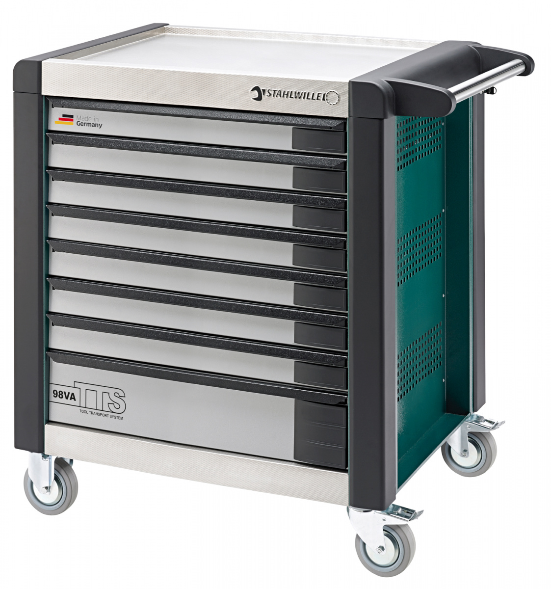 Dílenský vozík TTS 100% zvětený objem zásuvek oproti verzi 90, 95 a 95VA. 8 snadno vyjímatelných zásuvek s plnovýsuvem a pojezdem vybaveným loisky s kuličkovými průvodnicemi třístupňový bezpečnostní koncept:- centrální uzamykání pomocí bočního zámku s válcovou vlokou a odklápěcího klíčku- Samouzamykací zámky zamezí neúmyslnému otevření za jízdy- ochrana proti převrení - nelze současně vytáhnout více zásuvek najednou zásuvky lze označovat několika nálepkami na kadé zásuvce (arch s nálepkami je součástí dodávky) madlo z ulechtilé oceli se zesílením v místě připojení na korpus ochranné nárazníky s tlumením nárazu po celém obvodu odolná pracovní a odkládací plocha, s ochranou proti pokrábání, jako i nerezový ukončovací panel s kosočtvercovým reliéfem kolečka s kuličkovými loisky a snadným chodem o průměru 125 mm, odolná vůči olejům a kyselinám, s ochranou proti vláknům za účelem ochrany loisek před nečistotami a vlákny, se dvěma zajiovacími brzdami drák papírových rolí 5 standardních barev, dvoubarevné zásuvky (stříbrné s černým madlem) oboustranná deska s otvory pro háky č. 8031-8041, např. pro větí nástroje kze vybavit standardními i TCS vlokami firmy STAHLWILLE