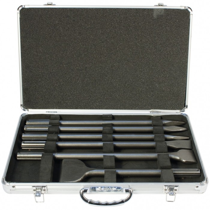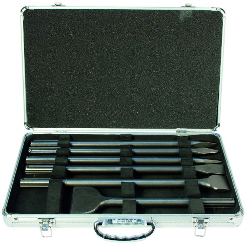 sada sekáčů SDS-max v Al kufru: 2x špičák 400mm, 2x sekáč plochý 25x400mm, 1x sekáč plochý 50x400mm,