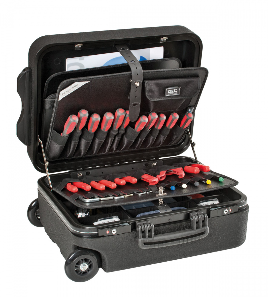 • Vysokokapacitní kufr s vystuženými rohy, ideální pro cestování letadlem a převážení jak nářadí, tak i náhradních dílů a ostatních komponentů.