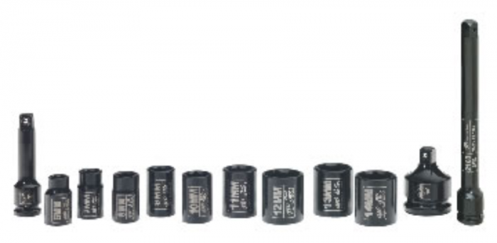 Sada obsahuje hlavice č.: 6 mm, 7 mm, 8 mm, 9 mm, 10 mm, 11 mm, 12 mm, 13 mm, 14 mm, 50 mm prodloužení, 100 mm prodloužení, redukce 3/8 "F -ž 1/4" M