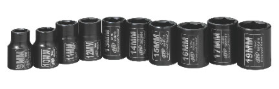 Sada obsahuje hlavice č.: 9 mm, 10 mm, 11 mm, 12 mm, 13 mm, 14 mm, 15 mm, 16 mm, 17 mm, 19 mm