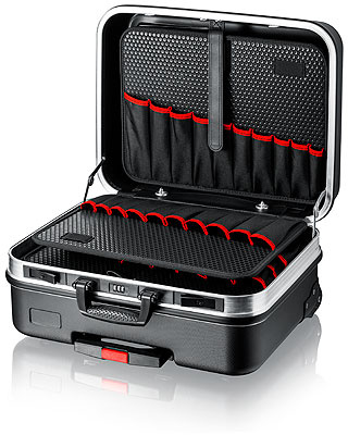 Dno ve tvaru vaničky, lze nastavit zmáčknutím tlačítka, výška 70 mm, lze rozdělit vložkami; krycí deska s 13 velkými kapsami na nářadí a plochou přihrádkou.
