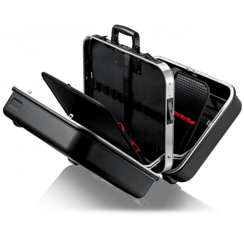 Samostatně stojící ve všech polohách otevření díky držákům víka s kloubovou mechanikou, umístěným z obou stran a volně nastavitelným úhlem. Lze otevřít z jedné nebo z obou stran; dno a víko lze otevírat nezávisle na sobě. Pole pro štítky se dvěma nálepkami pro individuální označení. Max. zatížitelnost: 25 kg. Objem: 38 litrů. Odolné provedení z materiálu ABS, černé. Obvodový hliníkový rám s pevně namontovanou, stabilní, oboustranně osaditelnou středovou stěnou, s mnohostrannými možnostmi zasunutí nářadí díky elastickým páskům a 12ti malým kapsami. Kovové panty. Kódovaný zámek otevíraný kombinací 3 čísel pro bezpečné uzamčení kufru.. Dva kovové sklápěcí zámky pro upevnění víka i spodku. Vytahovací police na dokumenty a vytahovací nástrojová deska vyrobené ze špínu odpuzujícího dvoustěnného plátu z PP s 13 kapsami na nástroje. Dno ve tvaru vaničky, lze nastavit stisknutím tlačítka, výška 58 mm, lze rozdělit pružnými vložkami; krycí deska se šesti velkými zasunovacími přihrádkami. S celkem 95 možnostmi zasunutí.