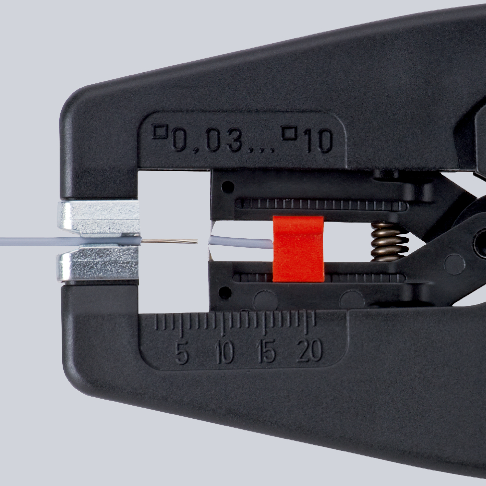 Odizolování bez dodatečného seřízení od 0,03 do 10,0 mm². Ve spodu kleští umístěné nůžky na dráty. univerzální geometrie nožů – robustní a s dlouhou životností. optimální tvarování rukojetí pro vynikající manipulaci. Plně automatické přizpůsobení všem jednovodičovým i vícevodičovým kabelům a kabelům s jemnými dráty se standardní izolací v celém kapacitním rozsahu 0,03 až 10,0 mm². Ve spodu kleští umístěné nůžky na stříhán kabelů z Cu a Al, vícevodičových do 10 mm² a jednovodičových do 6 mm². Nedochází k poškození vodičů. Upínací čelisti z oceli přidrží kabel bezpečně tak, aby nesklouzl, aniž by se poškodila zbývající izolace. Mimořádně lehký chod mechanismu a velmi nízká hmotnost. Výměnný nožový blok a délkový doraz. Rukojeť se zónou z měkkého plastu pro bezpečné uchopení. karton nebo blistr pro samoobslužný odběr.