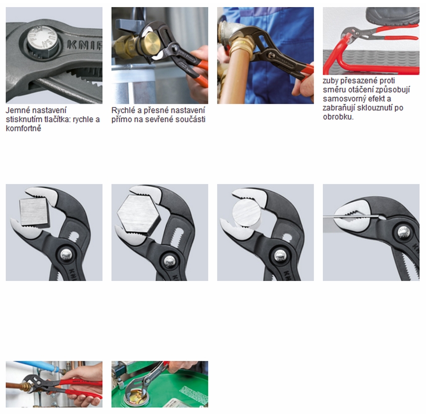 • samosvorné na trubkách a maticích: žádné sklouzávání na sevřené součásti, práce šetřící síly a vynaložení menší síly