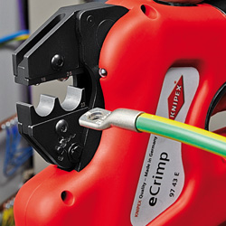 • Lisovací kleště KNIPEX eCrimp s elektromechanickým pohonem pro pohodlné, bezpečné lisování neizolovaných kabelových ok do 25 mm2 a koncových dutinek do 50 mm2.