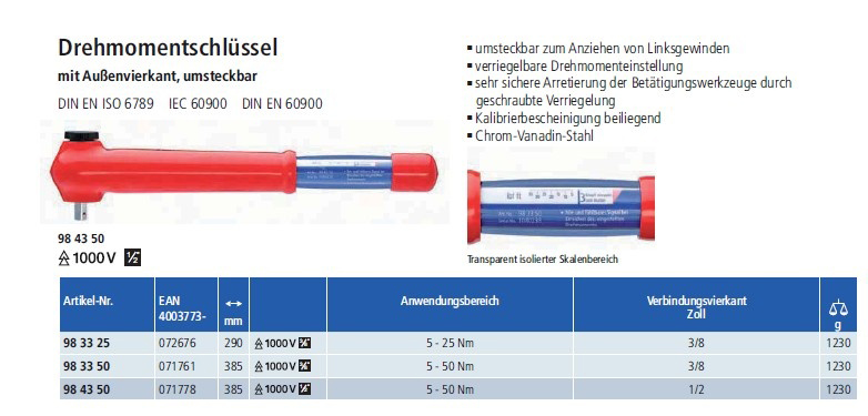 Momentový klíč KNIPEX 983325 s vnějším 3/8" čtyřhranem 5-25 Nm - 1 000 V.