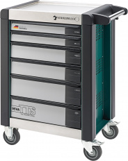 Dílenský vozík TTS 6 snadno vyjímatelných zásuvek s plnovýsuvem a pojezdem vybaveným loisky s kuličkovými průvodnicemi třístupňový bezpečnostní koncept:- centrální uzamykání pomocí bočního zámku s válcovou vlokou a odklápěcího klíčku- Samouzamykací zámky zamezí neúmyslnému otevření za jízdy- ochrana proti převrení - nelze současně vytáhnout více zásuvek najednou zásuvky lze označovat několika nálepkami na kadé zásuvce (arch s nálepkami je součástí dodávky) madlo z ulechtilé oceli se zesílením v místě připojení na korpus ochranné nárazníky s tlumením nárazu po celém obvodu odolná pracovní a odkládací plocha, s ochranou proti pokrábání, jako i nerezový ukončovací panel s kosočtvercovým reliéfem kolečka o průměru 125 mm, odolná vůči olejům a kyselinám, s ochranou proti vláknům za účelem ochrany loisek před nečistotami a vlákny, se dvěma zajiovacími brzdami drák papírových rolí 5 standardních barev, dvoubarevné zásuvky (stříbrné s černým madlem) oboustranná deska s otvory pro háky č. 8031-8041, např. pro větí nástroje kze vybavit standardními i TCS vlokami firmy STAHLWILLE