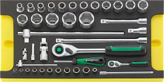 Vloky TCS pro vozík na nářadí č. 13217 pro vyjímatelnou odkládací přihrádku vozíku na nářadí č. 13217, nelze kombinovat s průhledným krytem 13217 TA. 455 x 240 x 30 mm, 40-dílná -------------------------------------------------------------------------------------------------------------------------- Č. 40 1/4" [a rozměr klíče 5,5; 6; 7; 8; 9; 10; 11; 12; 13; 14 mm Č. 52 1/2" [a rozměr klíče 10; 11; 12; 13; 14; 15; 16; 17; 18; 19; 20; 21; 22; 24; 27; 30; 32 mm Č. 400 1/4" [D 150 mm Č. 404 1/4" [D 116 mm Č. 405/2 1/4" [D [a 54 mm Č. 405/6 1/4" [D [a 150 mm Č. 407 1/4" [D [a 38 mm Č. 412 1/4" [b [a Č. 415QR N 1/4" [D Č. 506 1/2" [D 300 mm Č. 509/2 1/2" [D 52 mm Č. 509/5 1/2" [D [a 130 mm Č. 509/10 1/2" [D [a 255 mm Č. 510 1/2" [D [a 71 mm Č. 512QR N 1/2" [D --------------------------------------------------------------------------------------------------------------------------
