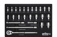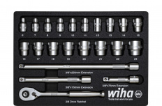 Zvýší vaši flexibilitu: Pravostranný/levostranný chod variabilně nastavitelný přepínací páčkou.Usnadní vám práci.: S praktickou pěnovou vložkou k přehlednému uložení.Zvýší vaši efektivnost: Šroubování bez přesazování díky klíči s ráčnou a jemným ozubením.Splňuje vaše požadavky: Konstrukčně přesný, robustní a snadno čistitelný.Dimensions: 280x197x32 mmPoužití: Na instalace a montáže.K vyšroubování velmi pevně zašroubovaných šroubů je zapotřebí enormní síla. S vložkami nástrčných klíčů Wiha uživatel snadno povolí každý šroubový spoj. Sada 18 nejběžnějších 3/8" vložek nástrčných klíčů ve velikostech 6–24 mm, klíče s ráčnou a tří prodlužovacích nástavců je skvělý doplněk výbavy každého uživatele. Přiložený klíč s ráčnou v kombinaci se sadou vybraných nástrčných klíčů dává uživateli potřebnou flexibilitu při každém pracovním zásahu. Při práci s klíčem s ráčnou má uživatel díky jemnému ozubení se 72 zuby zajištěn malý návratový úhel. Pravostranný/levostranný chod lze variabilně nastavovat pomocí integrované přepínací páčky. V kombinaci s přiloženými prodlužovacími nástavci se bez problémů dostanete i k hluboko uloženým maticím a šroubům. Nástrčné klíče a prodlužovací nástavce se aretují mechanicky. Výměna se provádí stisknutím uvolňovacího knoflíku. Vložky nástrčných klíčů vyrobené z jakostní chromvanadové oceli se pyšní dlouhou životností a velkou robustností, za které vděčí v neposlední řadě snadno čistitelnému povrchu odolnému proti korozi. Celý obsah sady je přehledně uložený v pěnové vložce, která díky označení usnadňuje nalezení správného nástrčného klíče.Na základě DIN 3124Obsah:1x Klíč s ráčnou pro nástrčné klíče 3/8" přepínatelný 178 mm (44686)1x Vložka nástrčných klíčů Oboustranný šestihran 3/8" 6.0 mm (44690)1x Vložka nástrčných klíčů Oboustranný šestihran 3/8" 7.0 mm (44691)1x Vložka nástrčných klíčů Oboustranný šestihran 3/8" 8.0 mm (44692)1x Vložka nástrčných klíčů Oboustranný šestihran 3/8" 9.0 mm (44693)1x Vložka nástrčných klíčů Oboustranný šestihran 3/8" 10.0 mm (44694)1x Vložka nástrčných klíčů Oboustranný šestihran 3/8" 11.0 mm (44695)1x Vložka nástrčných klíčů Oboustranný šestihran 3/8" 12.0 mm (44696)1x Vložka nástrčných klíčů Oboustranný šestihran 3/8" 13.0 mm (44697)1x Vložka nástrčných klíčů Oboustranný šestihran 3/8" 14.0 mm (44698)1x Vložka nástrčných klíčů Oboustranný šestihran 3/8" 15.0 mm (44699)1x Vložka nástrčných klíčů Oboustranný šestihran 3/8" 16.0 mm (44700)1x Vložka nástrčných klíčů Oboustranný šestihran 3/8" 17.0 mm (44701)1x Vložka nástrčných klíčů Oboustranný šestihran 3/8" 18.0 mm (44702)1x Vložka nástrčných klíčů Oboustranný šestihran 3/8" 19.0 mm (44703)1x Vložka nástrčných klíčů Oboustranný šestihran 3/8" 20.0 mm (44704)1x Vložka nástrčných klíčů Oboustranný šestihran 3/8" 21.0 mm (44705)1x Vložka nástrčných klíčů Oboustranný šestihran 3/8" 22.0 mm (44706)1x Vložka nástrčných klíčů Oboustranný šestihran 3/8" 24.0 mm (44707)1x Prodloužení 3/8" pro vložky nástrčných klíčů 75 mm (44687)1x Prodloužení 3/8" pro vložky nástrčných klíčů 150 mm (44688)1x Prodloužení 3/8" pro vložky nástrčných klíčů 250 mm (44689)1x Pěnová vložka