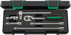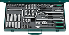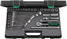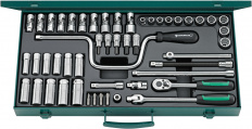Sada nástrčných klíčů 3/8" [u v pevné oceloplechové skříňce, 49-dílná Obsah: 11 ks nástrčná hlavice s dvojitým estihranem č. 45: rozměr klíče 8; 9; 10; 11; 12; 13; 14; 15; 16; 17; 18; 19 mm 9 ks nástrčná hlavice, prodlouená, č. 46: rozměr klíče 10; 11; 12; 13; 14; 15; 17; 18; 19 mm 2 ks nástrčná hlavice, prodlouená, s gumovou vlokou č. 4600: rozměr klíče 16 mm - 5/8", č. 46: rozměr klíče 20,8 mm - 13/16" 10 ks kloubová-hlavice nástrčná s dvojitým estihranem č. 47: rozměr klíče 10; 11; 12; 13; 14; 15; 16; 17; 18; 19 mm 5 ks INHEX-hlavice č. 49: rozměr klíče 3; 4; 5; 6; 7; 8; 10 mm 4 ks Bits [k 1231: velikost 1; 1232: velikost 2; 1233: velikost 3; 1234: velikost 4; 1 ks ráčna č. 435 2 ks prodluovací díl č. 427/3 (76 mm) a č. 427/10 (240 mm) 1 ks kloubovaá rukoje č. 424 1 ks kříová rukoje č. 425 1 ks kardanový kloub č. 428 1 ks ohebný prodluovací díl č. 434 1 ks drák bitů č. 443