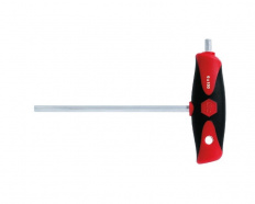 Šroubovák s dvojslokovou rukojetí, na šrouby s vnitřním šestihranem, se dvěma hroty, legovaná ocel chrom-vanad, matně pochromovaná, černé hroty.