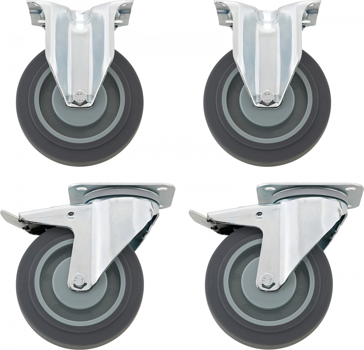 Sada koleček skládá se ze 2 pevných a 2 otočných koleček o průměru 125 mm, z těch je 2 vybavenou fixační brzdou.