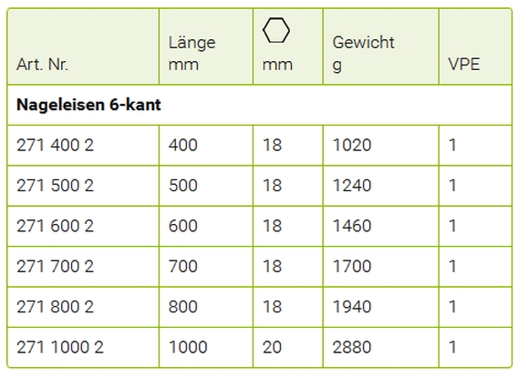 • (Art. No. 271 1000 2) 1 x Páčidlo s rozštěpem, šestihranné 20 x 1000mm
