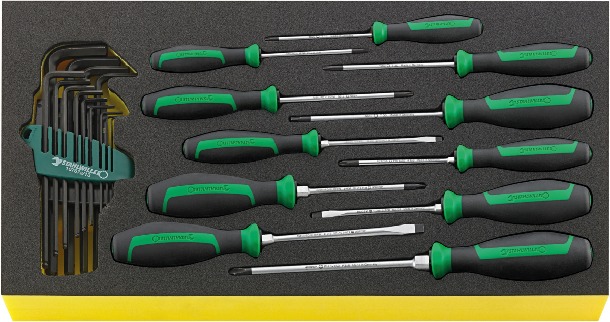 Vloky TCS pro vozík na nářadí č. 13217 pro zásuvky vozíku na nářadí č. 13217, 460 x 250 x 60 mm, 24-dílná. ------------------------------------------------------------------------------------------------------------------------------- Č. 4622SK velikost 1 (0,8 x 4,0 x 90 mm)velikost 2 (1,0 x 5,5 x 100 mm)velikost 3 (1,2 x 6,5 x 125 mm) Č. 4632SK velikost 1; 2; 3 Č. 4650 velikost T10; T15; T20; T25; T30 Č. 10767a/13 rozměr klíče 0,050; 1/16; 5/64; 3/32; 7/64; 1/8; 9/64; 5/32; 3/16; 7/32; 1/4; 5/16; 3/8" -------------------------------------------------------------------------------------------------------------------------------