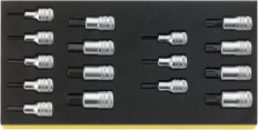 Vloky TCS pro vozík na nářadí č. 13217 pro zásuvky vozíku na nářadí č. 13217, 460 x 250 x 60 mm, 20-dílná. ------------------------------------------------------------------------------------------------------------- Č. 4622SK velikost 1 (0,8 x 4,0 x 90 mm)velikost 2 (1,0 x 5,5 x 100 mm)velikost 3 (1,2 x 6,5 x 125 mm) Č. 4630 velikost 1 Č. 4632SK velikost 1; 2; 3 Č. 4650 velikost T6; T7; T8; T9; T10; T15; T20; T25; T27; T30 Č. 4650 velikost T10; T15; T20; T25; T30 Č. 4724 velikost 2 (1,0 x 5,5 x 25 mm) Č. 4734 velikost 2 Č. 10767H/9 rozměr klíče 1,5; 2; 2,5; 3; 4; 5; 6; 8; 10 mm -------------------------------------------------------------------------------------------------------------