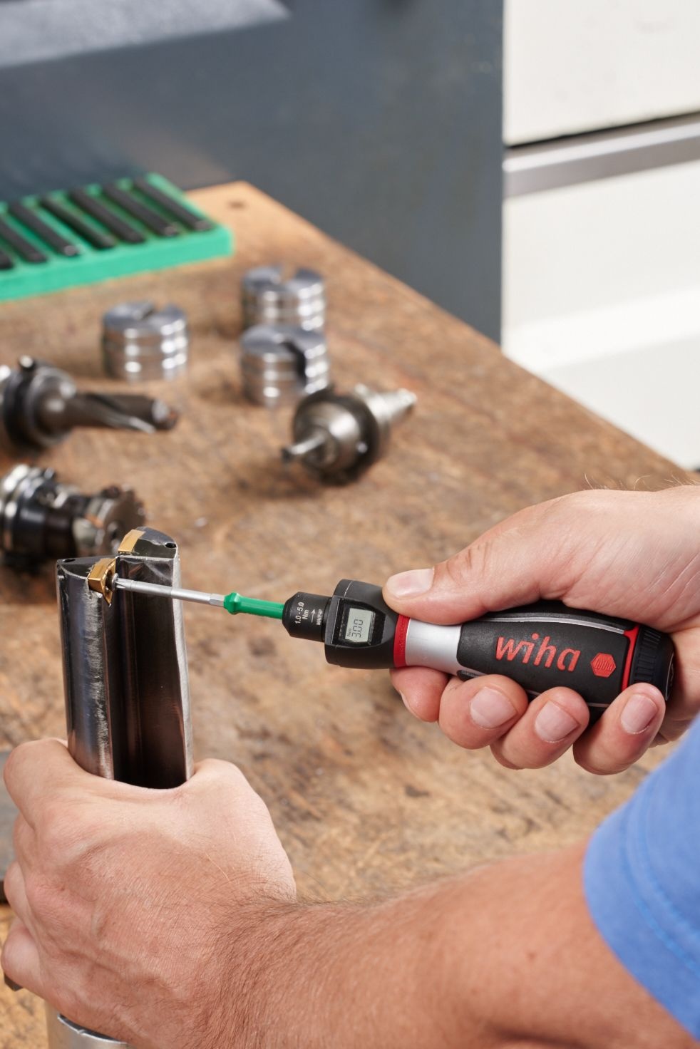 Při výměně vyjímatelných břitových destiček je podstatné kontrolované šroubování se zadaným momentem, aby nedošlo k poškození. Nápravu poskytuje momentový šroubovák iTorque®, který lze popsat slovy inteligentní, inovativní a individuální. Krytkou na konci rukojeti iTorque® může být jednoduše a plynule nastavena požadovaná hodnota v Nm. Navíc je možné přestavení jednotky momentu z Nm na in.lbs. Pomocí velkého digitálního displeje s numerickým zobrazením lze rychle a jednoduše odečítat nastavenou hodnotu v Nm. S přesností vypnutí +/-6 % momentový nástroj splňuje požadavky DIN EN ISO 6789. Integrované počitadlo dokumentuje počet uvolnění, což je zvlášť důležité pro sledování zkušebního prostředku. Funkce alarmu uživateli včas připomene specifikovaný kalibrační cyklus, který je z výroby nastaven na 5 000 aplikací, a v případě potřeby může být individuálně přizpůsoben. Ergonomicky tvarovaná rukojeť s měkkými částmi dále umožňuje optimální manipulaci s momentovým šroubovákem. V sadě je obsažený jeden univerzální držák nástavců pro upnutí nástavců 1/4". iTorque® je navíc kompatibilní s výměnnými dříky Wiha Torque 4 mm (série 2859).