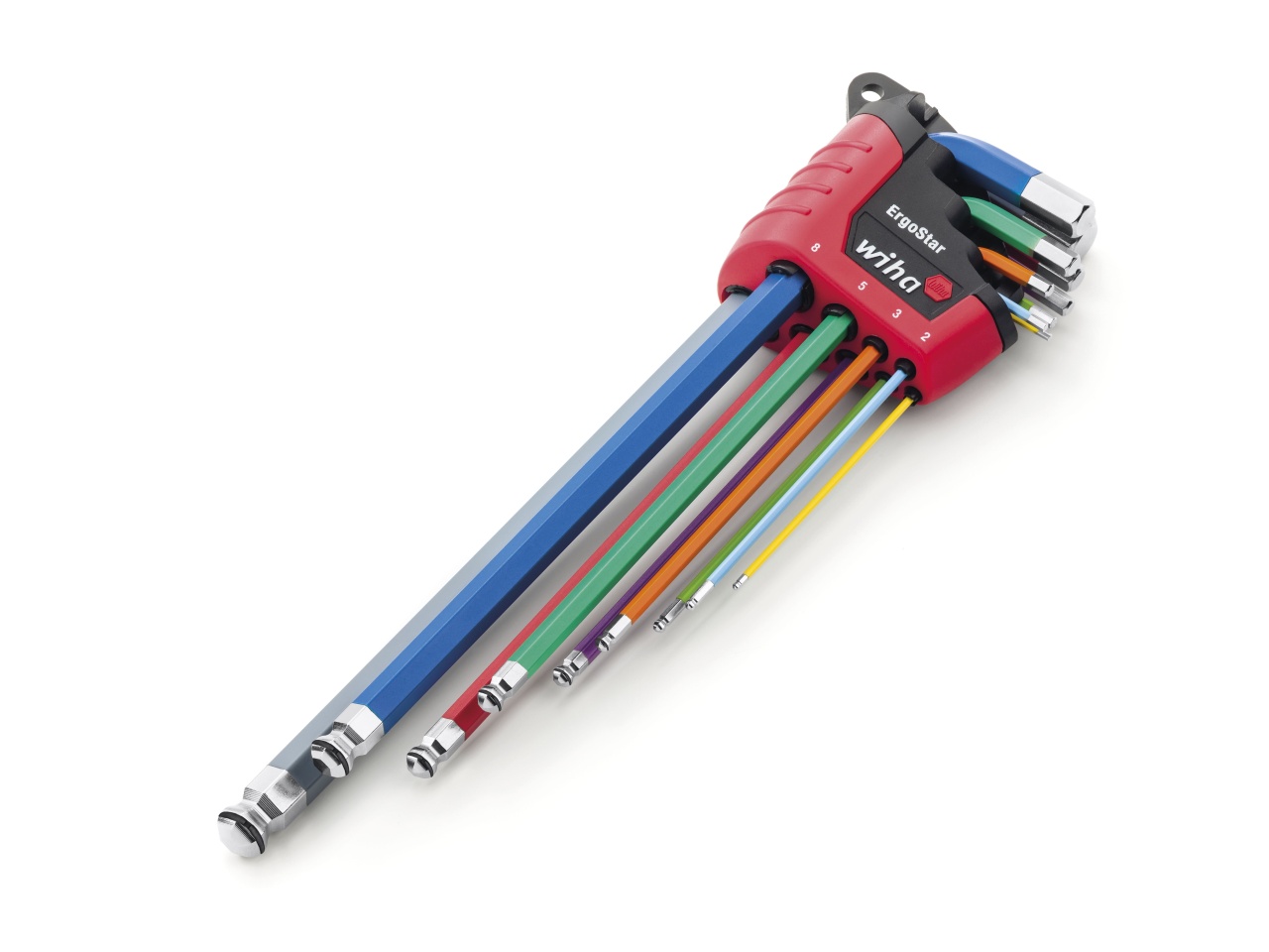 Kdo to nezná? U mnoha držáků zástrčných klíčů je třeba zdlouhavě vyjímat jednotlivé klíče nebo je zase zavádět zpět do držáku. Ale s tím je už nyní díky Wiha ErgoStar konec, neboť tento systém geniálním způsobem vyřešil tento problém. Otáčení samostatného zástrčného klíče v držáku vede k tomu, že se všechny ostatní klíče otáčejí ve stejném úhlu ke straně, a tím je umožněno rychlé a pohodlné vyjímání. Sevření v držácích zajistí, že klíče nemohou vypadnout jak u uzavřeného, tak i otevřeného držáku. Navíc lze barevné zástrčné klíče rychle a jednoduše najít a díky svíticímu laku je dobře najdete i ve tmě za pomoci UV světla. Zkrátí se tím doba hledání ztraceného zástrčného klíče a při údržbě zařízení se sníží nebezpečí zapomenutí nástrojů ve stroji. Díky přídržné funkci MagicRing s pružným ocelovým kroužkem zástrčné klíče perfektně udržují v jakékoli poloze všechny šestihranné normované šrouby bez magnetu. Šestihranná kulová hlava umožňuje snadné šroubování pod úhlem až 25°. Sada zástrčných klíčů obsahuje devět barevných šestihranných zástrčných klíčů v běžných velikostech.