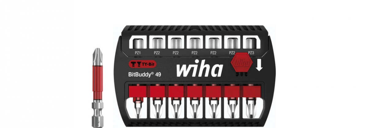 Žádná ruka není volná a už máte dost náročného hledání správného nástavce? Wiha BitBuddy® umožňuje přímé zachycení nástavců ve stroji i jednoduché zpětné zavedení do držáku. Díky novému uspořádání nástavců v držáku i velikosti profilu vyrytého laserem na zadním čele nástavce bude výběr správné velikosti při vyjmutí nástavce velmi snadný. Obsažený nástavec TY je jako multitalent vhodný pro všechny druhy šroubů, jak pro šrouby ve tvaru T, tak i pro šrouby ve tvaru Y, a tím představuje ideální nástroj pro šroubení do všech materiálů. Díky patentované, prodloužené torzní zóně je nástavec také vhodný pro šroubováky Impact a nárazové utahováky a zaručuje 120x delší životnost ve srovnání se standardními nástavci Wiha. Navíc lze barevné nástavce rychle a jednoduše najít a díky barevnému plášti je dobře najdete i ve tmě za pomoci UV světla.