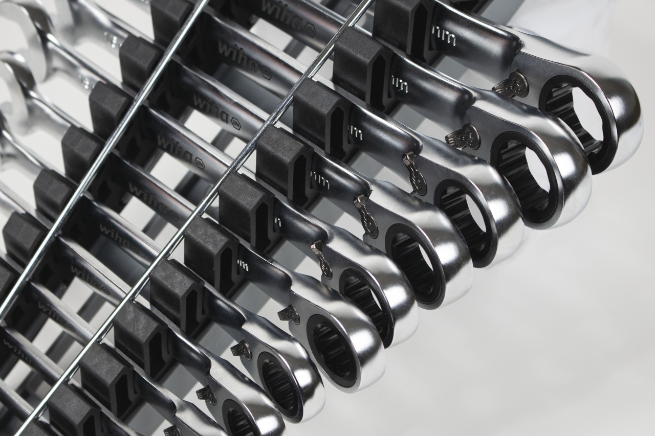 K vyšroubování velmi pevně zašroubovaných šroubů je zapotřebí enormní síla. S otevřenými klíči s prstencovou ráčnou Wiha uživatel snadno povolí každý šroubový spoj díky pákovému efektu. Konec s otevřeným klíčem je kromě toho vhodný i k zajišťování šroubů a matic. Díky nastavení rozevření v úhlu 15° je konec s otevřeným klíčem dokonale vhodný na práce ve stísněných místech. I při práci s prstencovou ráčnou má uživatel díky dvojitému šestihranu a jemnému ozubení se 72 zuby zajištěn malý návratový úhel a maximální pohodlí při práci ve stísněných prostorových podmínkách. Pravostranný/levostranný chod lze variabilně nastavovat pomocí integrované přepínací páčky. Otevřené klíče s prstencovou ráčnou vyrobené z jakostní chromvanadové oceli se pyšní dlouhou životností a velkou robustností, za které vděčí v neposlední řadě snadno čistitelnému povrchu odolnému proti korozi. Sada obsahuje 12 nejběžnějších velikostí od 8 do 19 mm přehledně uložených v praktickém držáku. Při vyjímání klíče vhodné velikosti lze držák otevírat jednou rukou.Neklouzavý povrch zajišťuje pevné uchopení i při znečištění olejem či ve vlhkém pracovním prostředí.