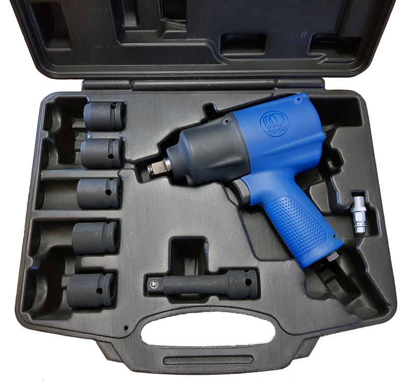 RÁZOVÝ KLÍČ V SADĚ: Rázový utahovák MI-17C, 5 x 1/2" rázové hlavice (17 - 19 - 21 - 22 - 24 mm) a 1 x prodlužovací tyč 100 mm Tento kompozitní rázový utahovák TOKU má vynikající poměr hmotnosti a výkonu. MI-17C byl vyvinut pro montážní a demontážní účely. Rázový mechanismus Twin Hammer má vysokou úroveň energie při každém úderu, a proto je vhodný pro použití v těžkých podmínkách. Energie je přiváděna přímo na hnací hřídel, což zajišťuje maximální výkon a minimální údržbu. Toto nářadí je vhodné pro průmyslové použití. Uvolňovací moment: 1 600 Nm.