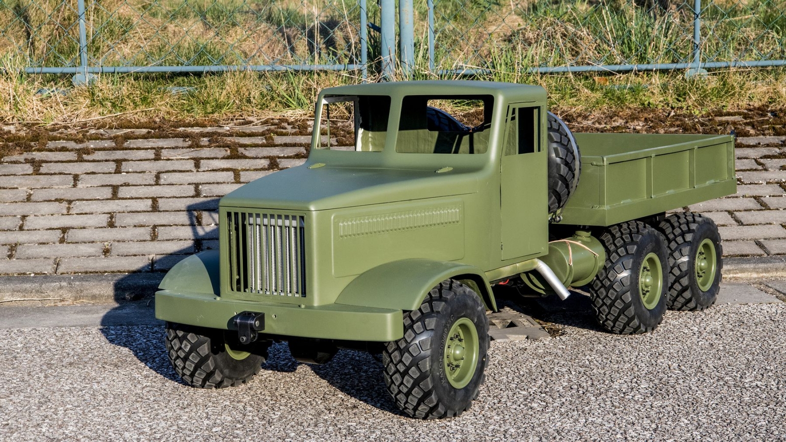 This Russian truck was designed to tow the KA-52 helicopter to its starting position using a special towing device... Model is constructed in the scale of 1: 6. Tubeless free tyre with proprietary rims, differential lock on all axles, three-speed gearbox with hardened gears. AC motor drive 6 kW, Lipo 2x6S 44 V, 5,000 mAh, 80 A regulator. Width of 490 mm, length of 1,330 mm, height of 496 mm.