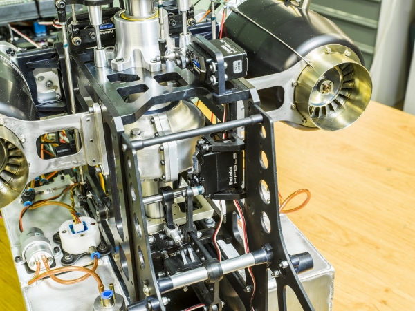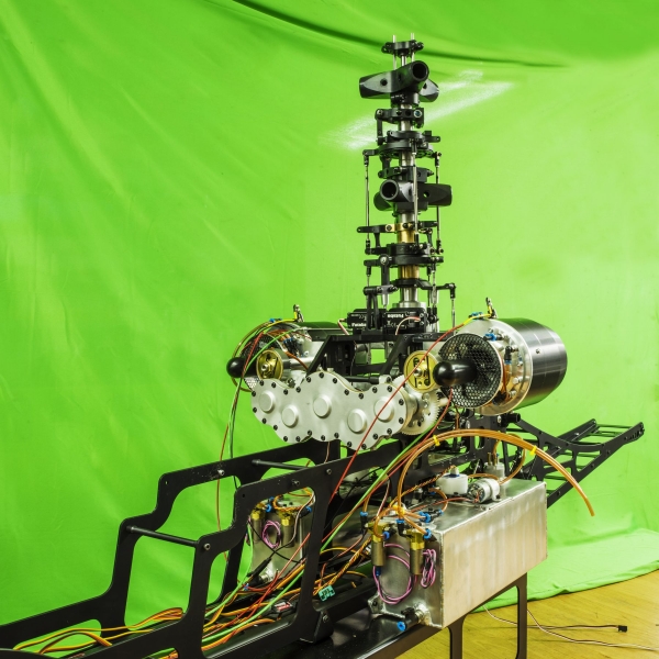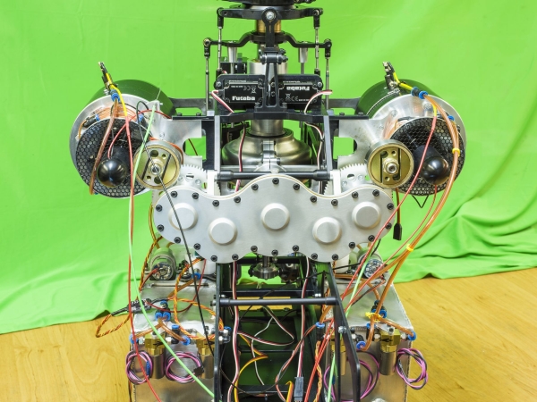 Привод обеспечивается двумя турбинами Jakadofsky 2x 6 кВт при 100 000 об/мин. Обороты несущего винта 880 об/мин. Топливо керосин Jet A1. Все подчинялось самому низкому весу. Фюзеляж вертолета выполнен из углеродных волокон, несущая конструкция из высокопрочного Al сплава 7075, выхлопные трубы и тяга из титана. Самый длинный вал ротора Ø 20x630, просверленный по всей длине из материала 14220, цементированный и шлифованный. Бортовая электроника 8,4 В, приемник, передатчик и телеметрия компании Jeti. Сервоприводы компании Futaba HPS H700 44 кг/см и HPS A700 74 кг/см.